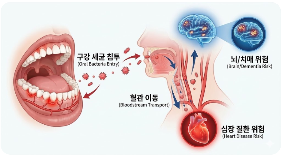 잇몸 질환(치주염)을 일으키는 대표적인 주범은 '포르피로모나스 진지발리스(P. gingivalis)'라는 세균입니다. 잇몸에 염증이 생겨 상처가 나면, 이 세균들은 그 틈을 타 혈관으로 직접 침투합니다. 이를 '균혈증'이라고 하죠.