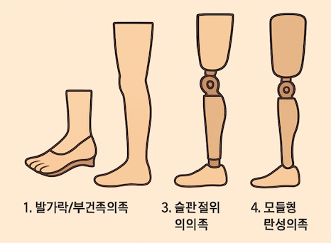 - 발가락 절단: 깔창+지팡이 → 필요시 부분족 의족