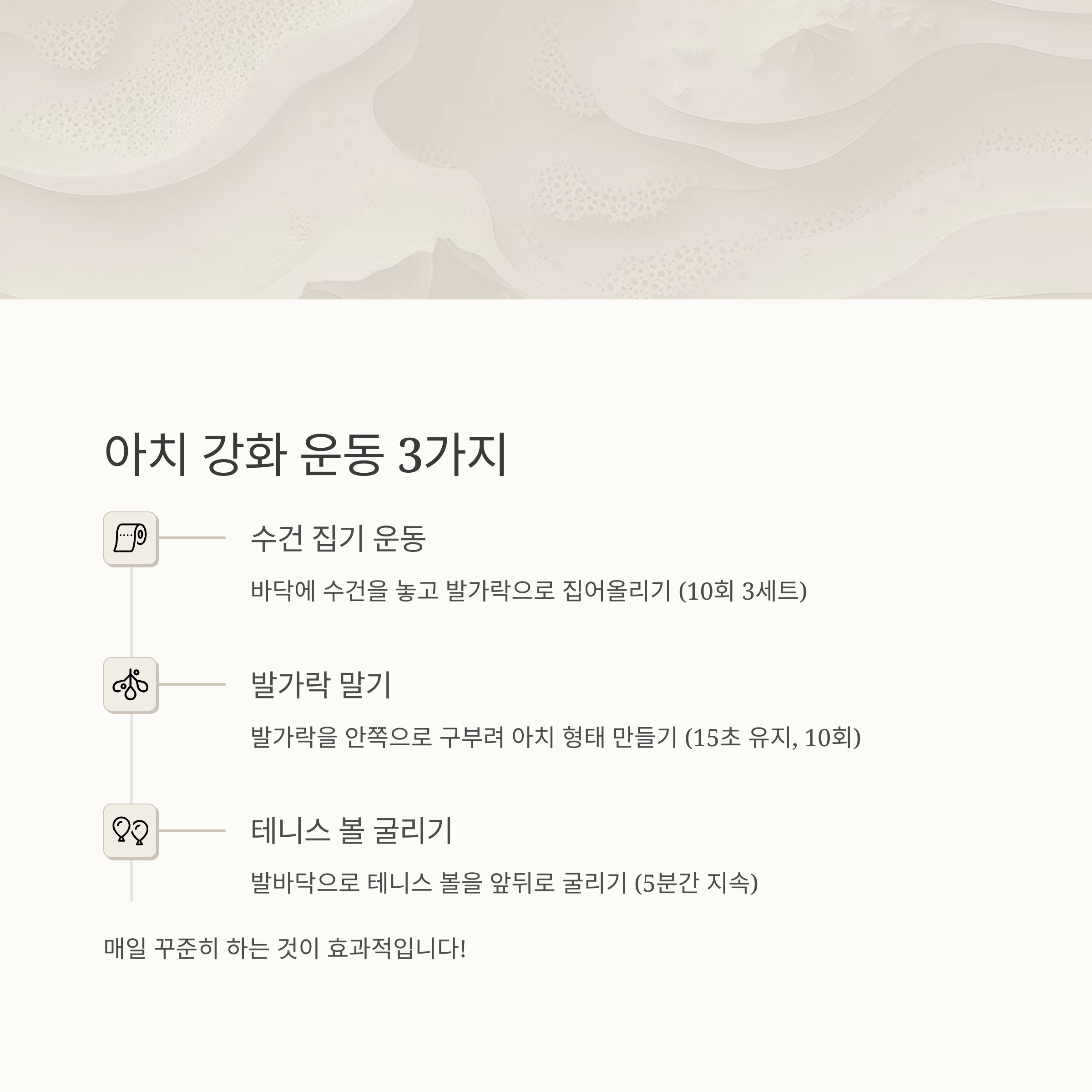 간단한 스트레칭 동작만으로도 족저근막과 발바닥 근육을 강화할 수 있습니다. 예: 발가락으로 수건 집기, 발바닥 롤링.