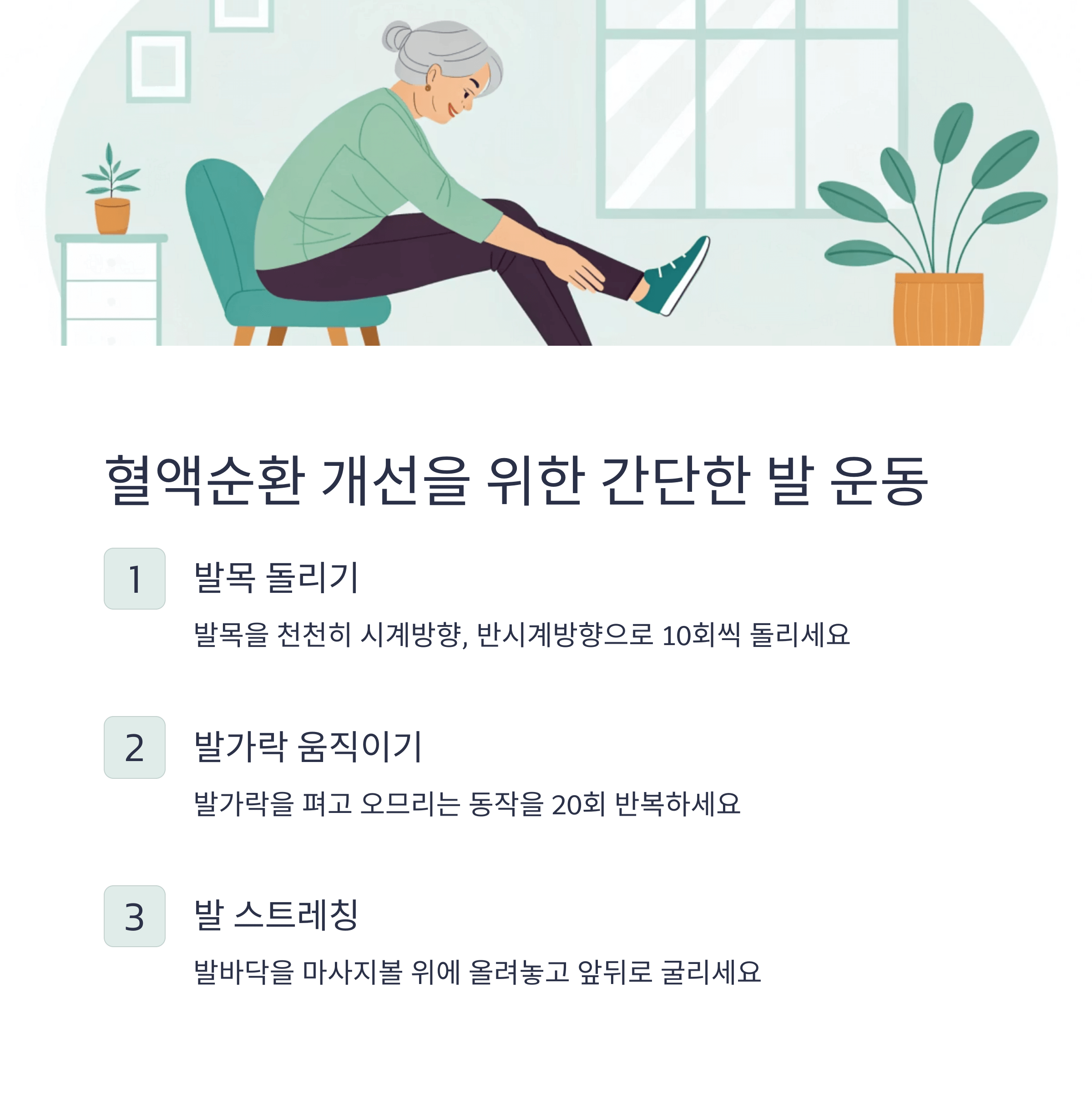 발끝 들기, 발목 돌리기, 발가락 구부리기 등 간단한 운동으로 말초 혈류를 개선할 수 있습니다.