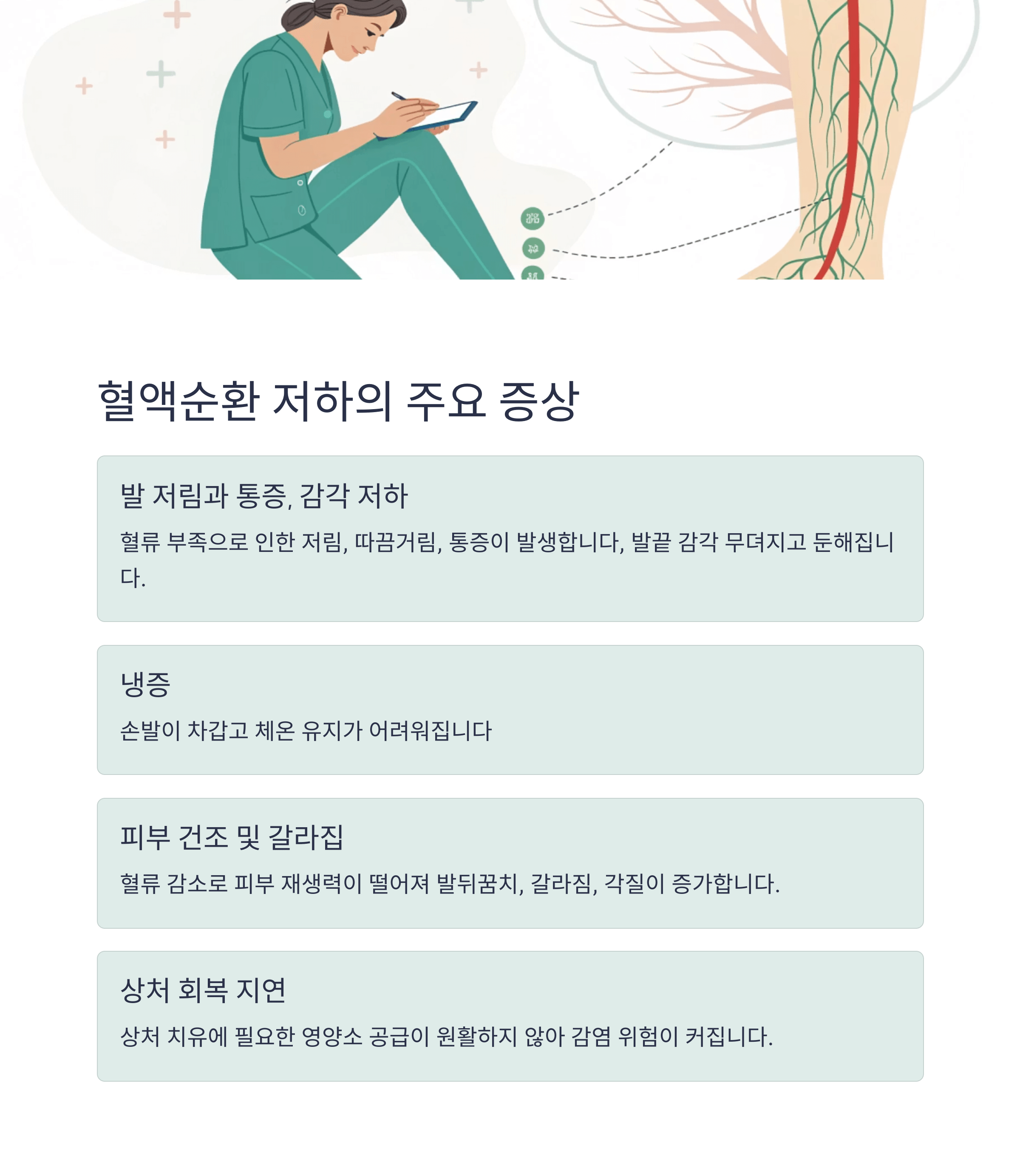 - 냉증 및 통증: 발끝이 차가워지고, 특히 밤에 쥐가 자주 나거나 욱신거리는 통증이 나타날 수 있습니다.