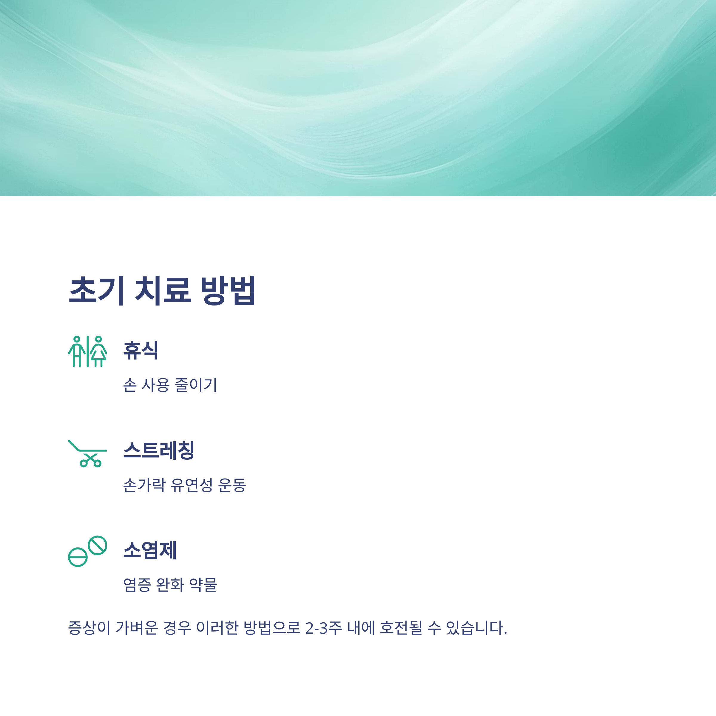 부드러운 스트레칭과 마사지가 증상 완화에 도움이 됩니다. 손바닥을 펴고 손가락을 하나씩 천천히 늘려주는 동작이 효과적입니다.