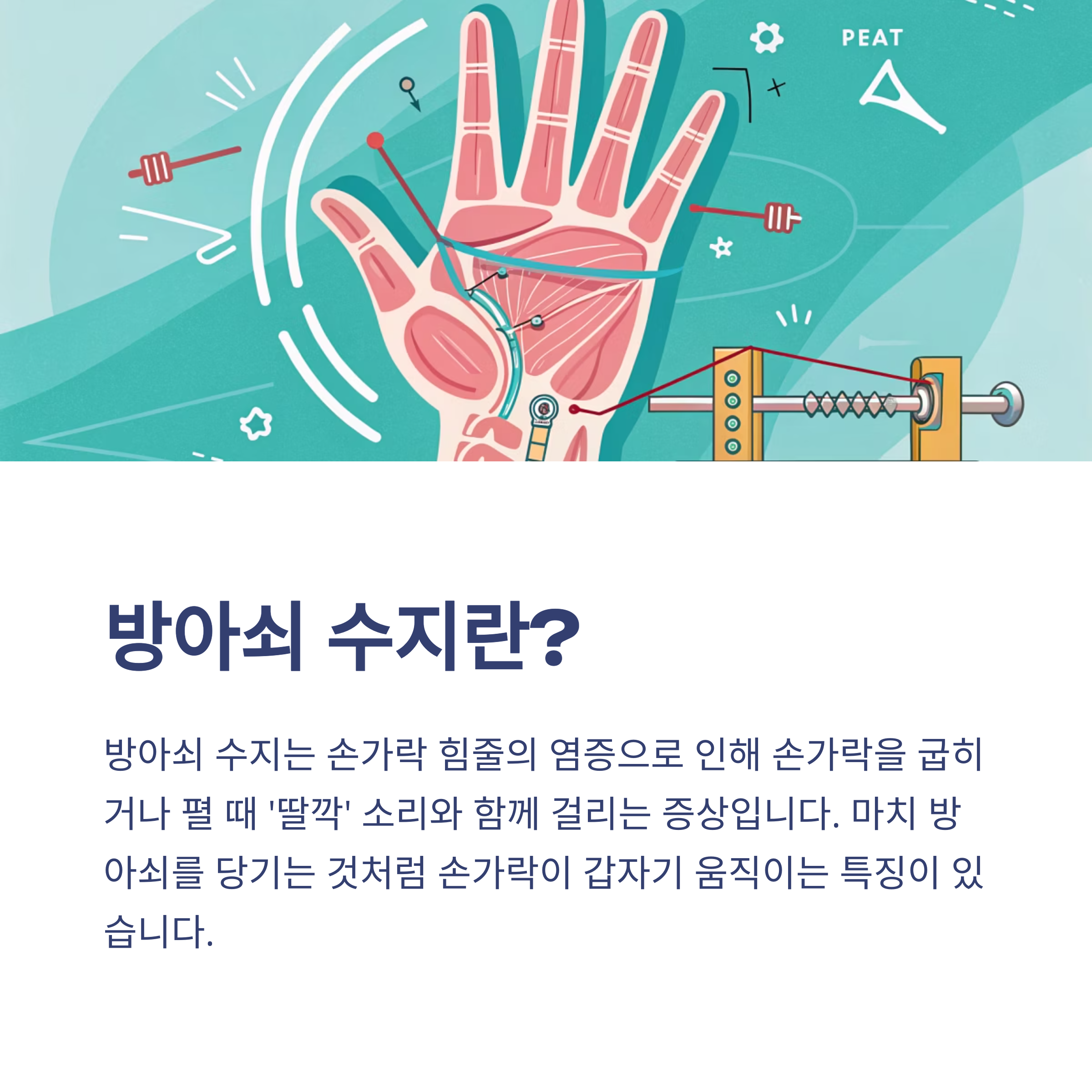방아쇠 수지는 반복적인 손 사용, 당뇨병, 류마티스 관절염, 갑상선 질환 등과 관련이 있으며, 40~60대 여성에게 흔하게 발생합니다. 특히 손을 많이 사용하는 주부나 직장인에게 자주 나타납니다.