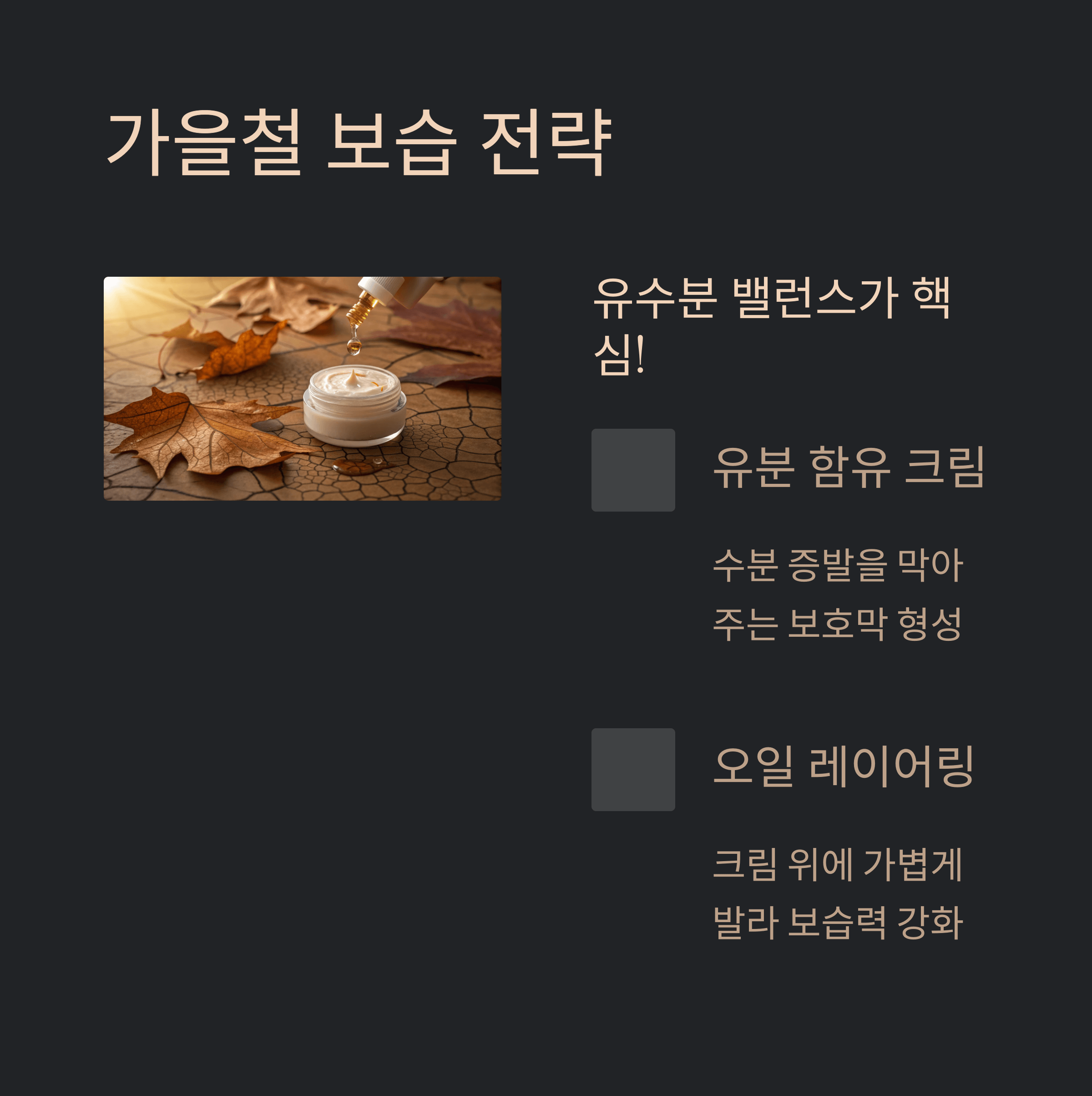 - 기온과 습도가 급격히 낮아지며 피부 당김이 심해지므로 유수분 밸런스를 맞추는 보습이 필요합니다.
