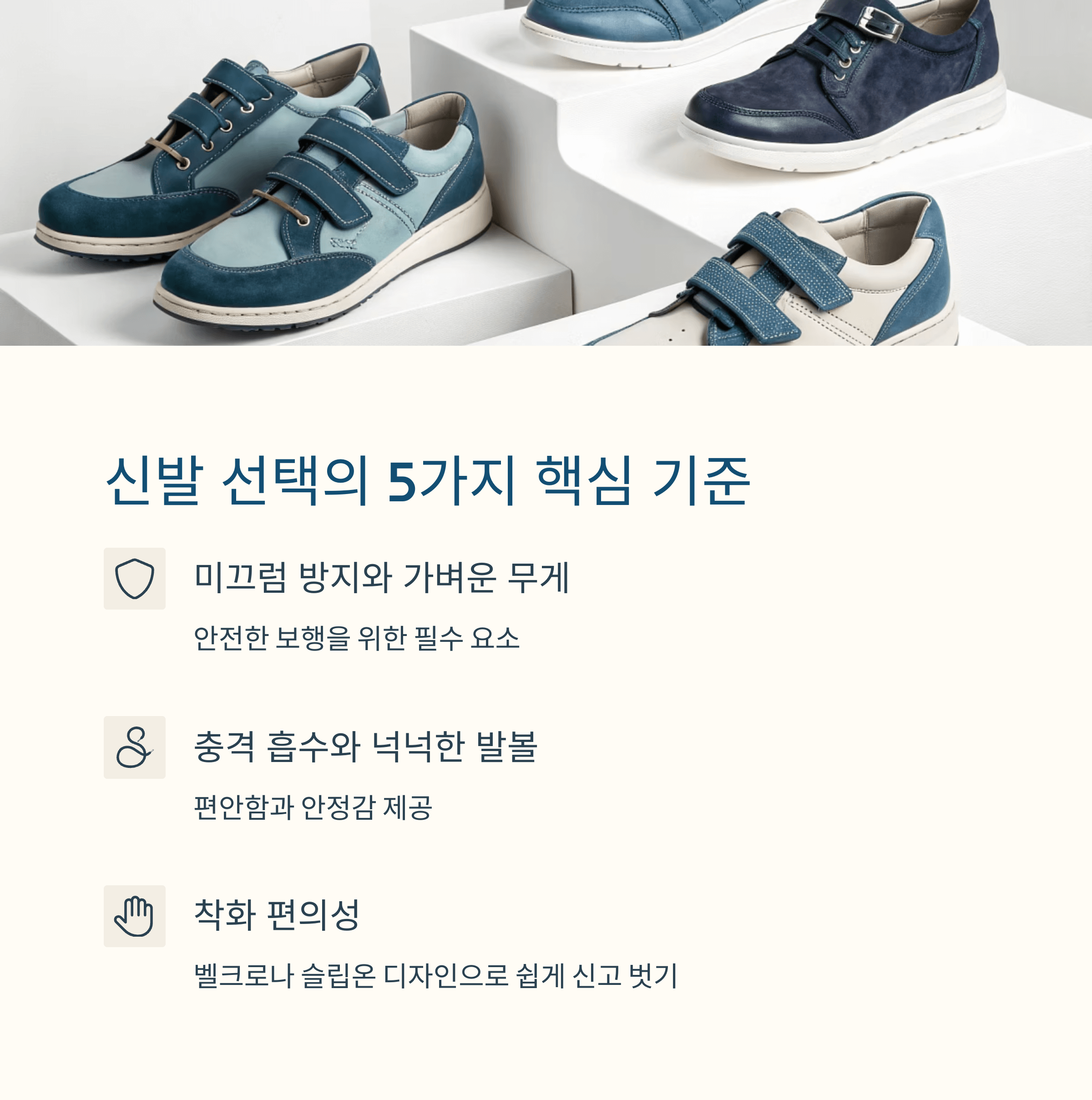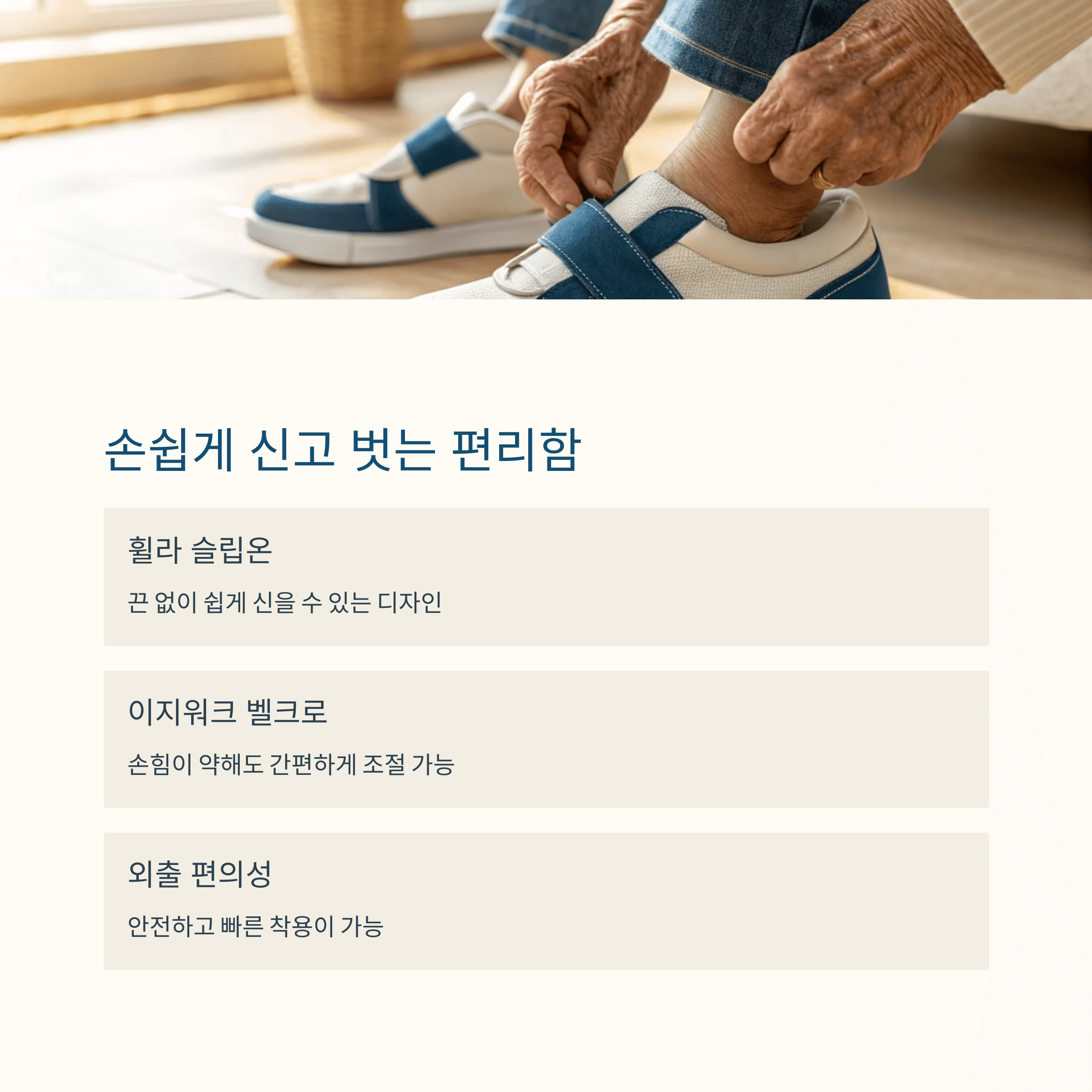 착화 용이성: 벨크로나 슬립온 구조로 쉽게 신을 수 있어야 함