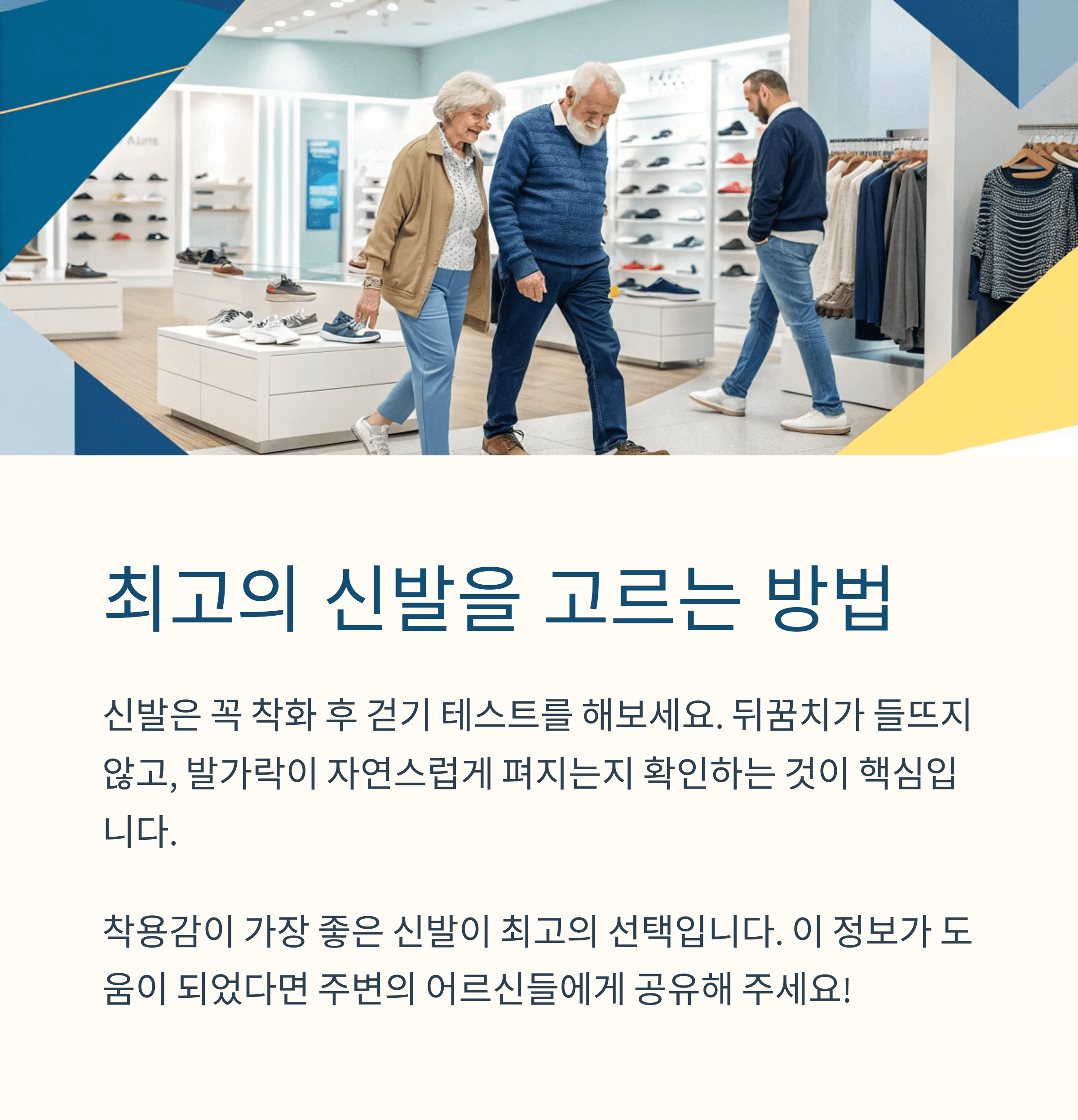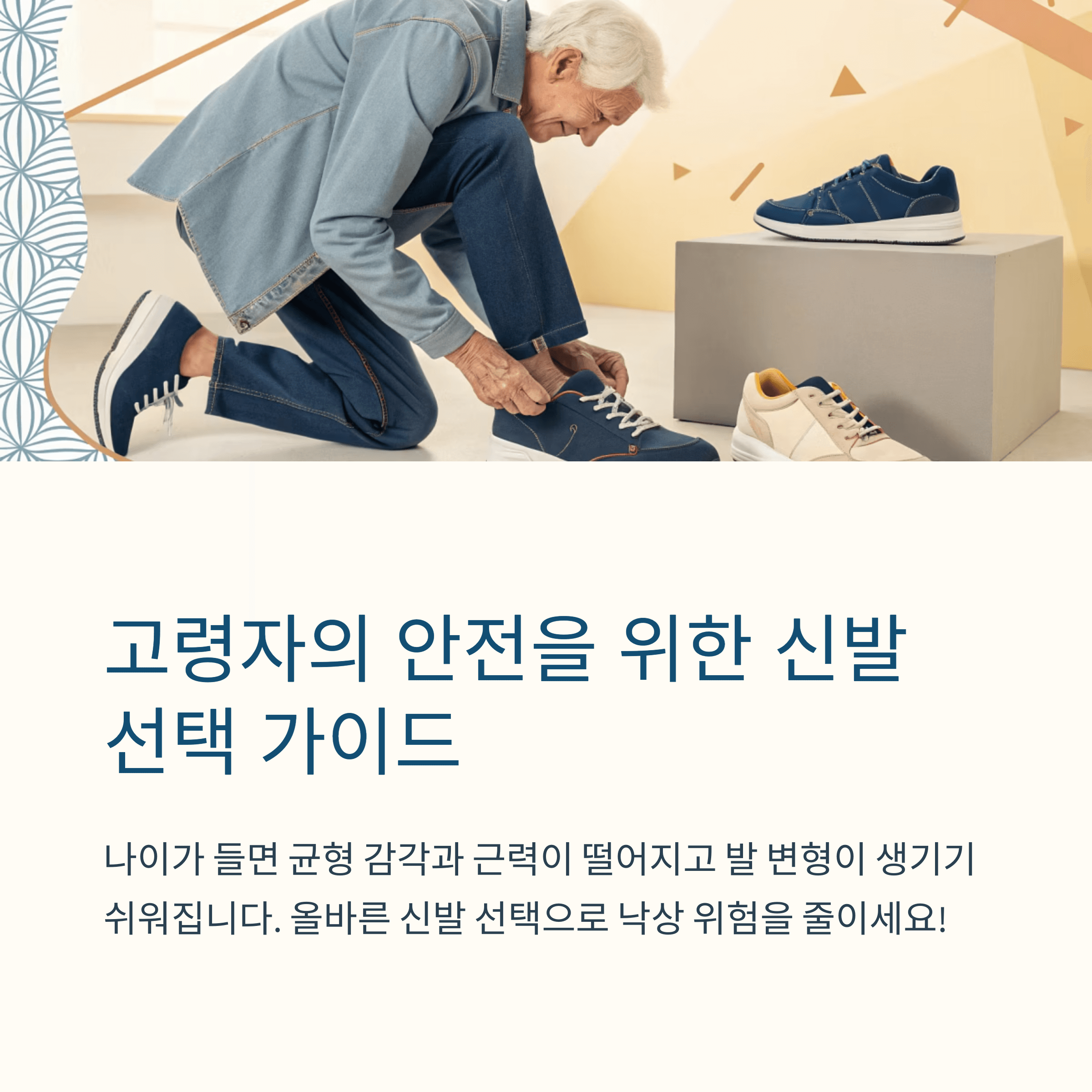 노화로 인해 발의 균형 감각이 감소하고 근력이 약해지며, 관절 질환이나 족부 변형이 생길 수 있습니다. 이로 인해 신발 선택이 매우 중요해지며, 미끄럼 방지, 충격 흡수, 편한 착화 구조를 갖춘 고령자용 신발이 필수입니다. 올바른 신발은 낙상 예방과 보행 안정성을 크게 높여줍니다.