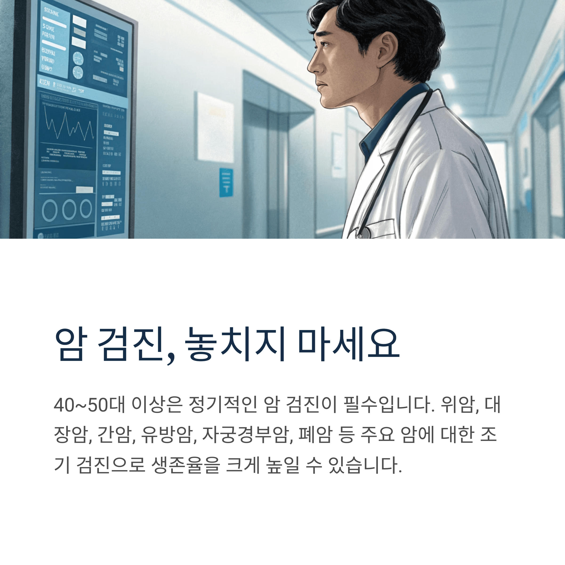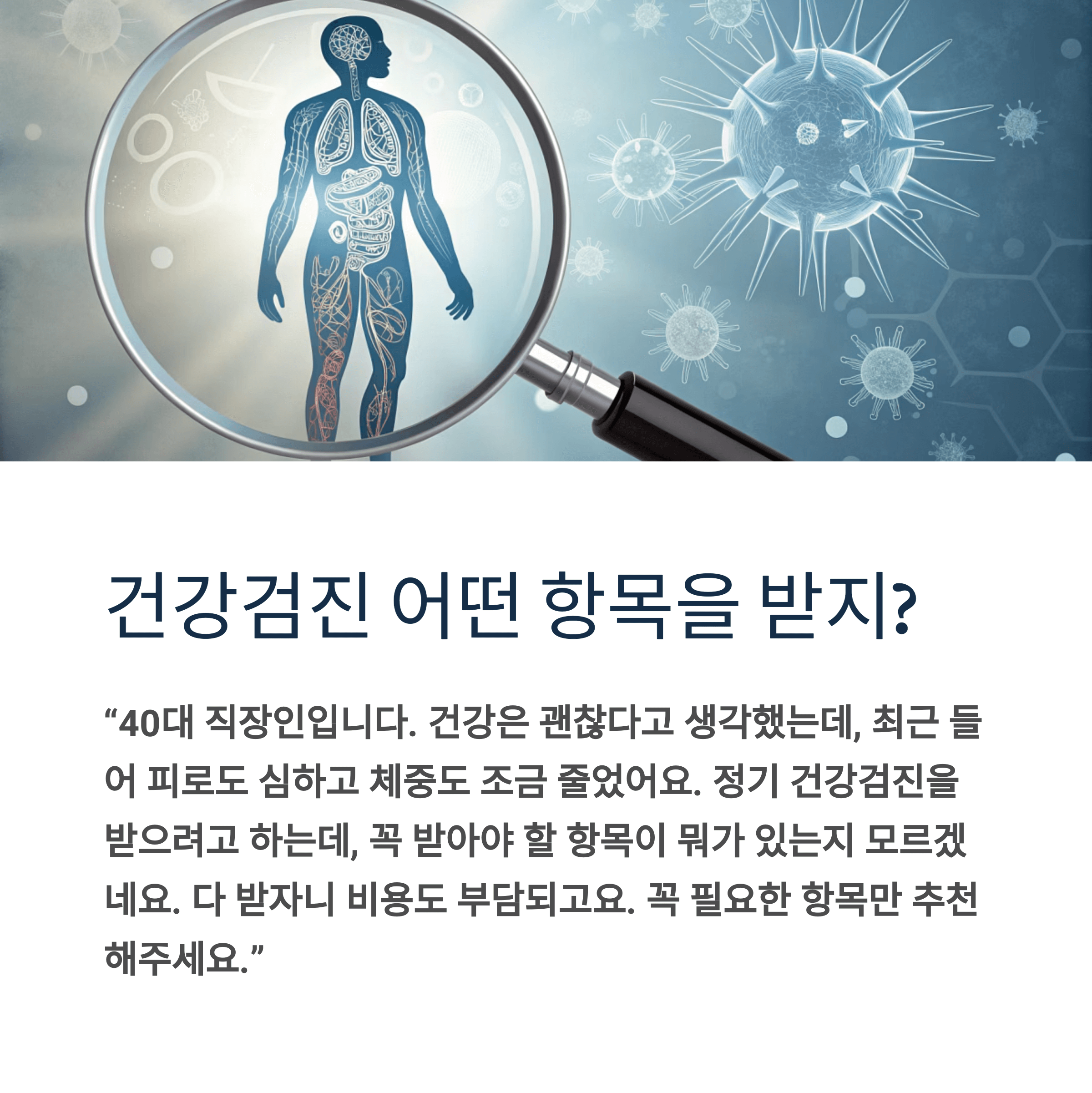 “40대 직장인입니다. 건강은 괜찮다고 생각했는데, 최근 들어 피로도 심하고 체중도 조금 줄었어요. 정기 건강검진을 받으려고 하는데, 꼭 받아야 할 항목이 뭐가 있는지 모르겠네요. 다 받자니 비용도 부담되고요. 꼭 필요한 항목만 추천해주세요.”