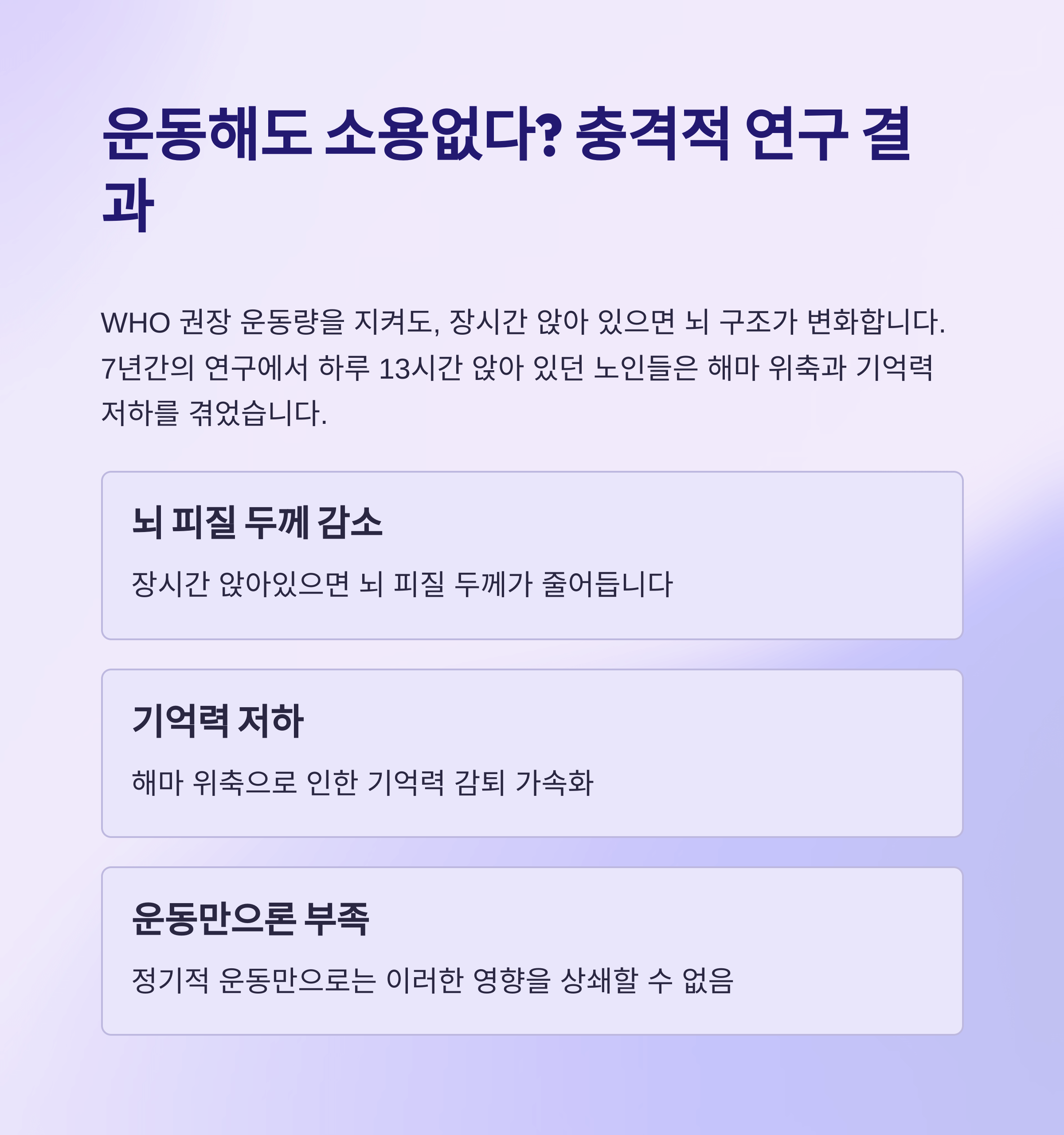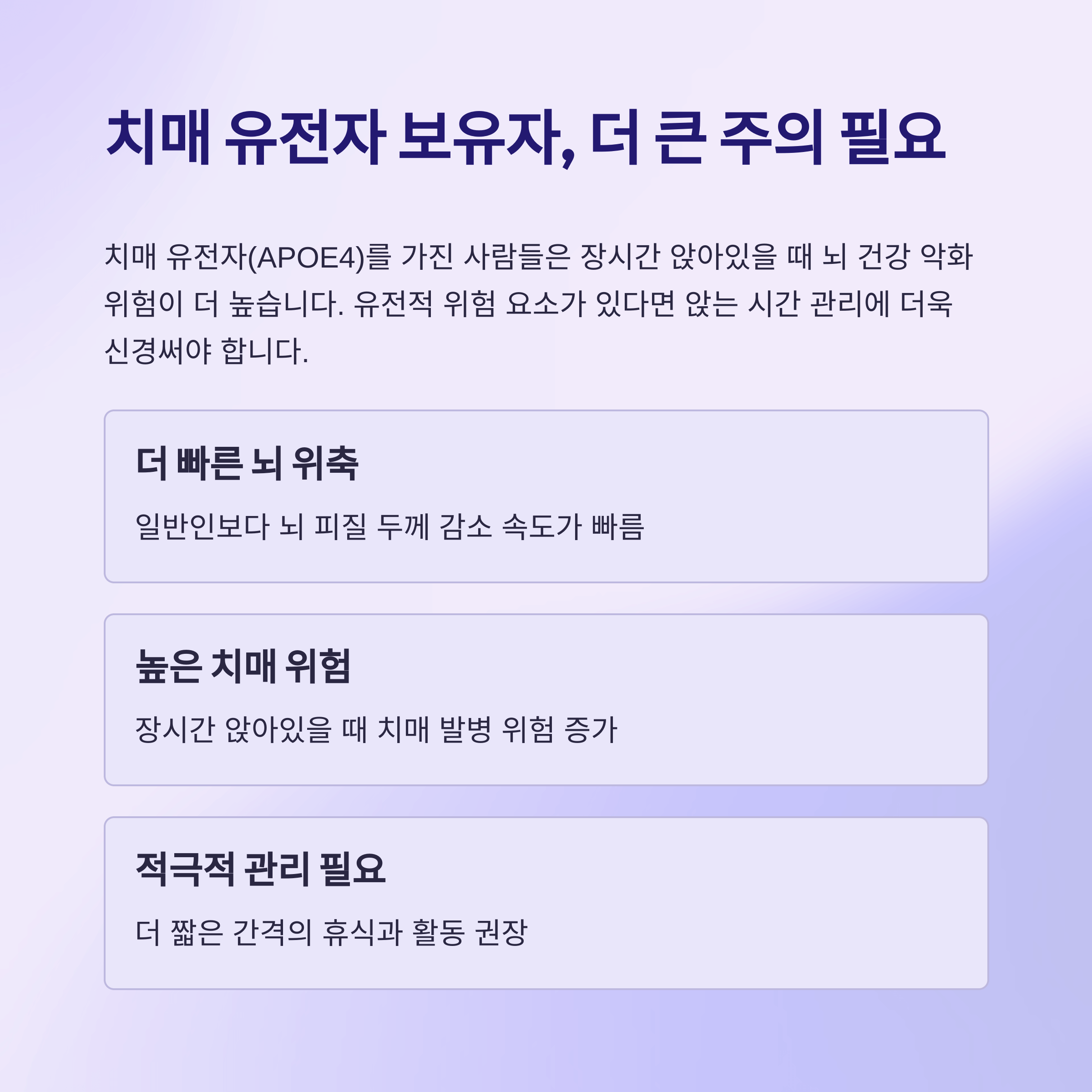 연구 참가자들은 WHO 권장 운동량인 주당 150~300분 중강도 운동을 지켰지만, 긴 시간 앉아 있는 습관은 뇌 피질 두께 감소와 해마 위축을 불러왔습니다. 특히 치매 위험 유전자(APOE-ε4)를 가진 사람들은 더 큰 영향을 받았습니다.