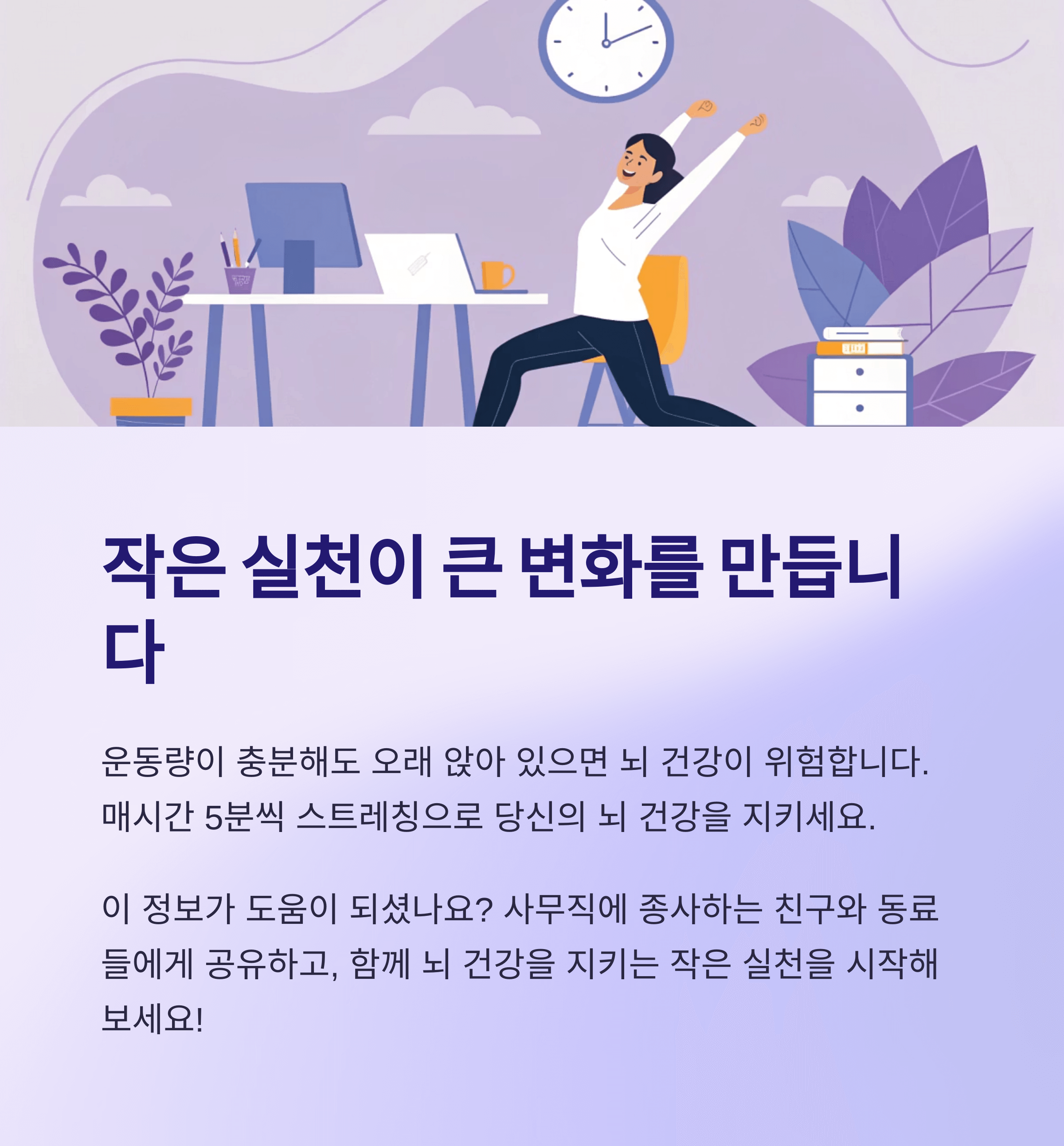 다음 알람이 울리면 자리에서 일어나 2분간 목과 어깨를 부드럽게 돌려주세요! 작은 습관이 뇌 건강에 큰 변화를 만듭니다.