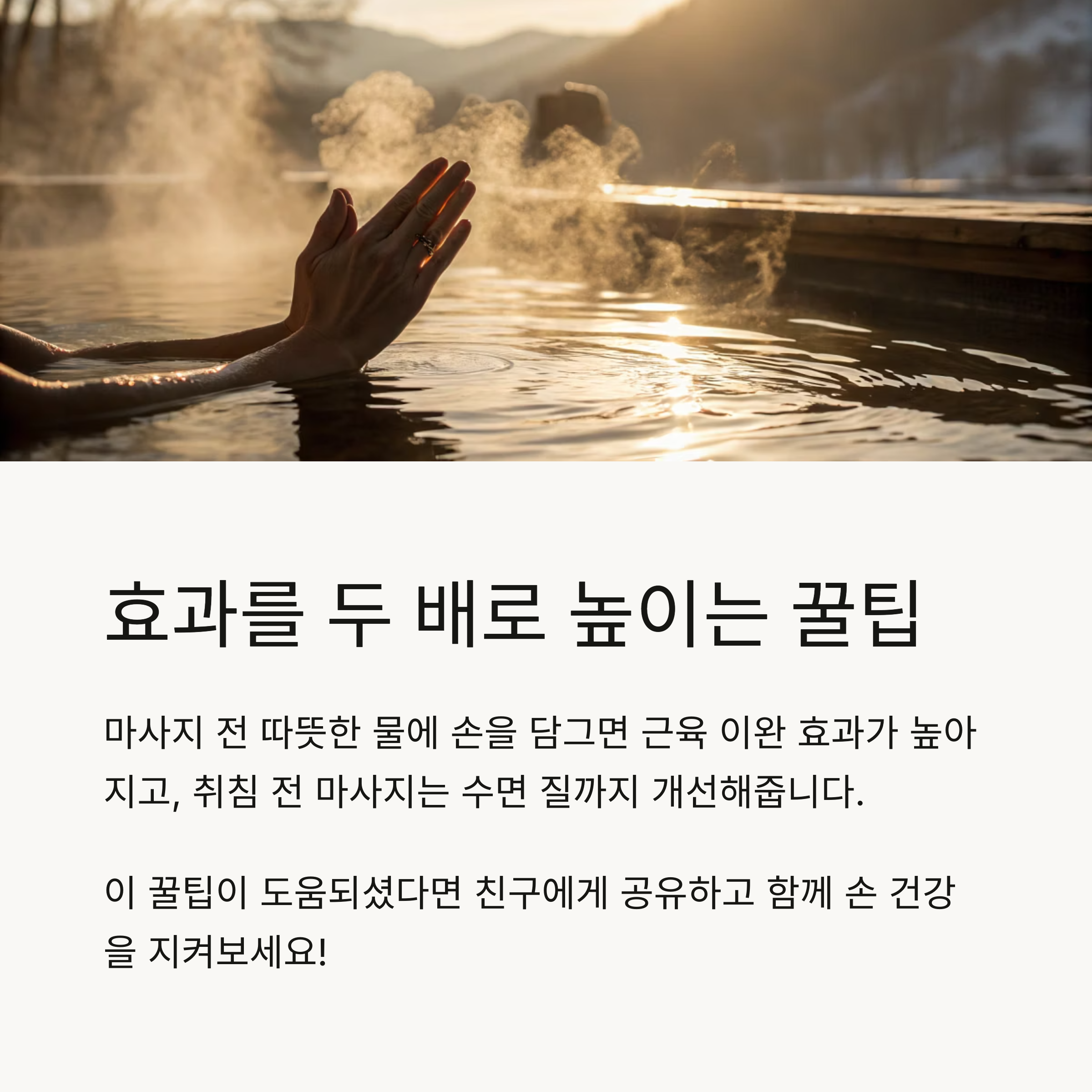 마사지를 하기 전 따뜻한 물에 손을 2~3분 정도 담그면 근육이 이완되어 마사지 효과가 더욱 높아집니다. 또, 자기 전 간단한 손 마사지를 습관화하면 수면 질 개선에도 도움을 줄 수 있습니다.