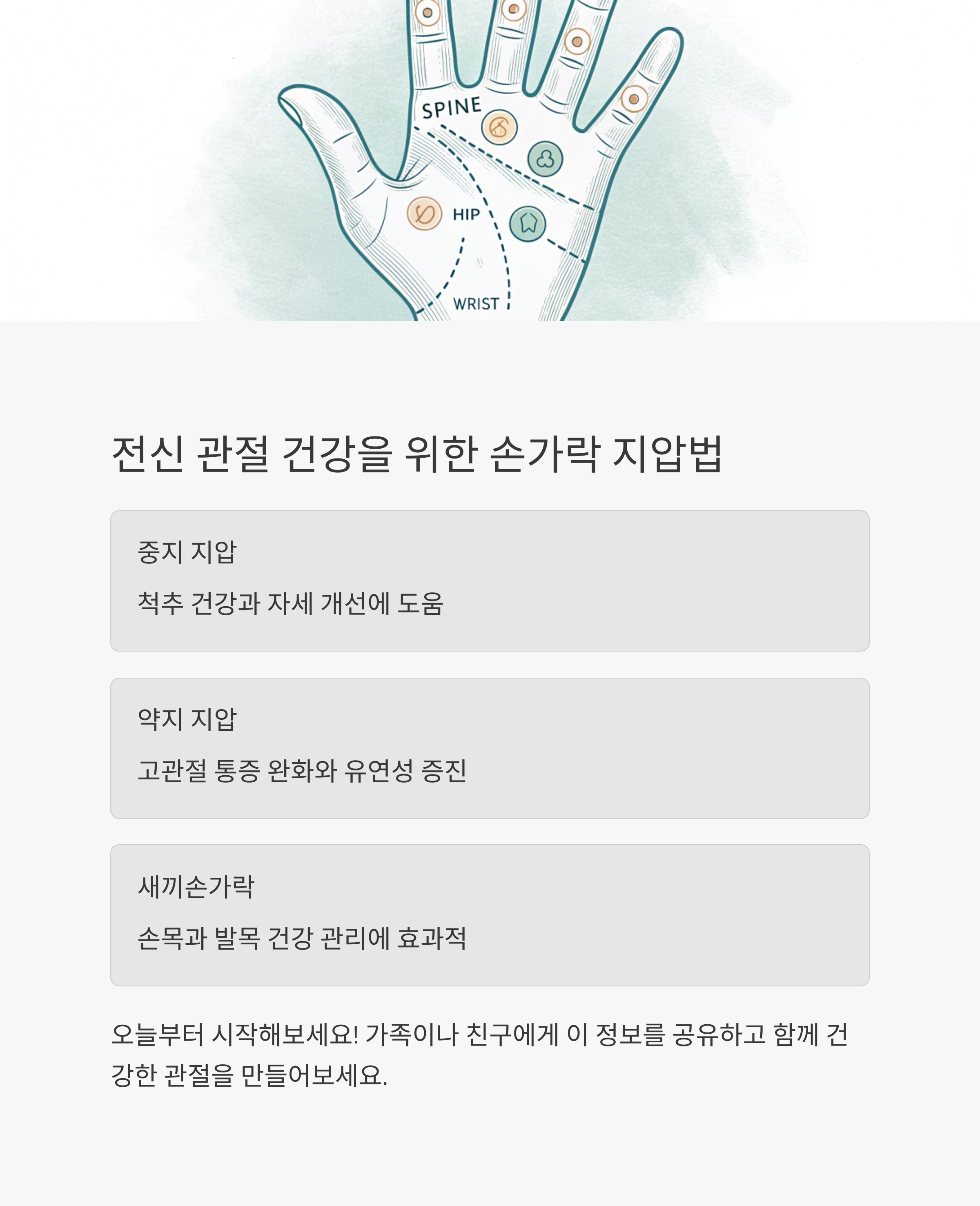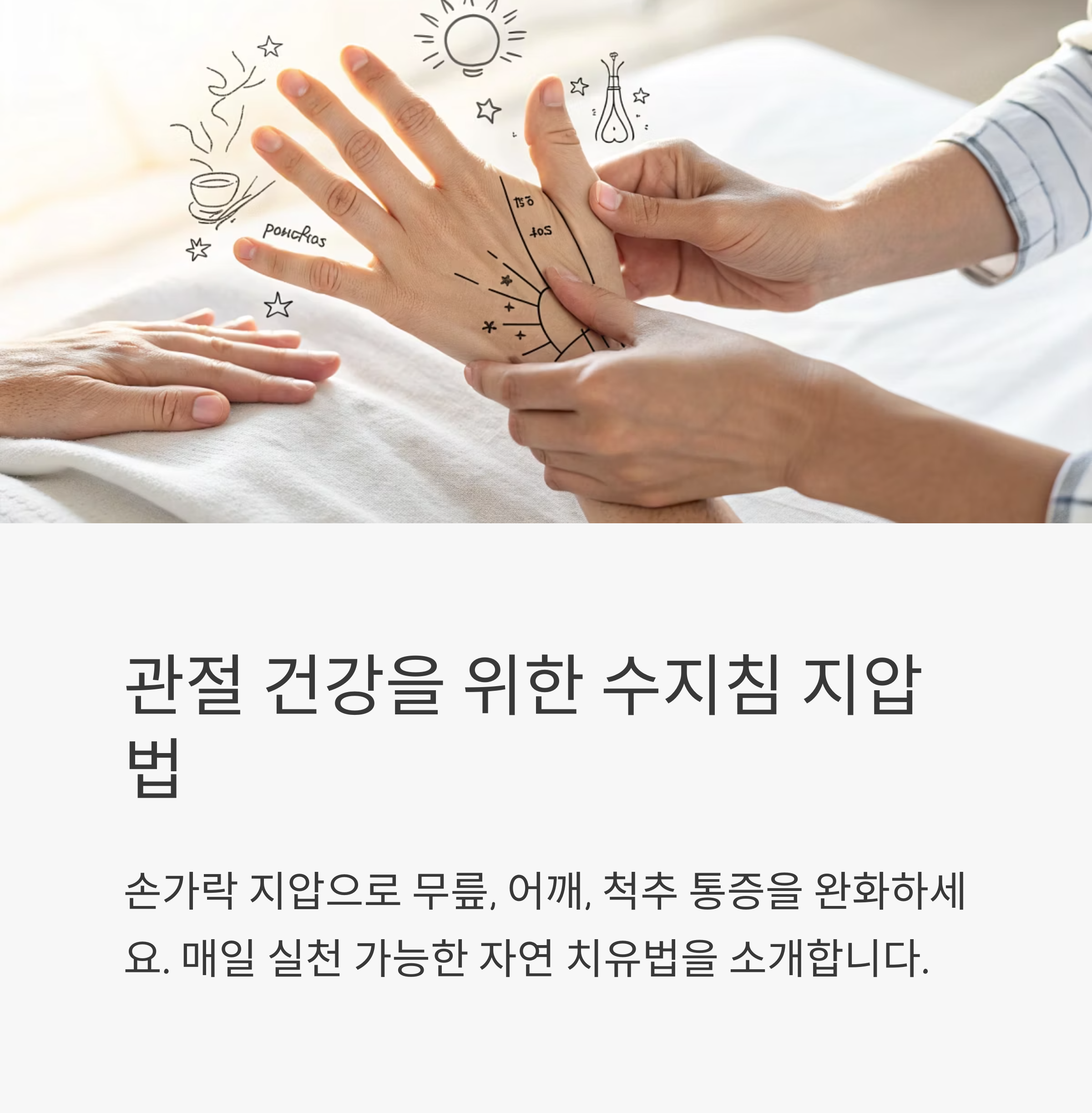 관절 건강은 꾸준한 관리가 핵심입니다. 수지침은 일상에서 쉽게 실천할 수 있는 자연요법으로, 정기적인 지압만으로도 통증 개선과 혈류 순환에 큰 도움이 됩니다. 복잡한 약물이나 수술에 의존하기 전에, 수지침을 통해 자연스럽게 건강을 회복해보는 건 어떨까요?