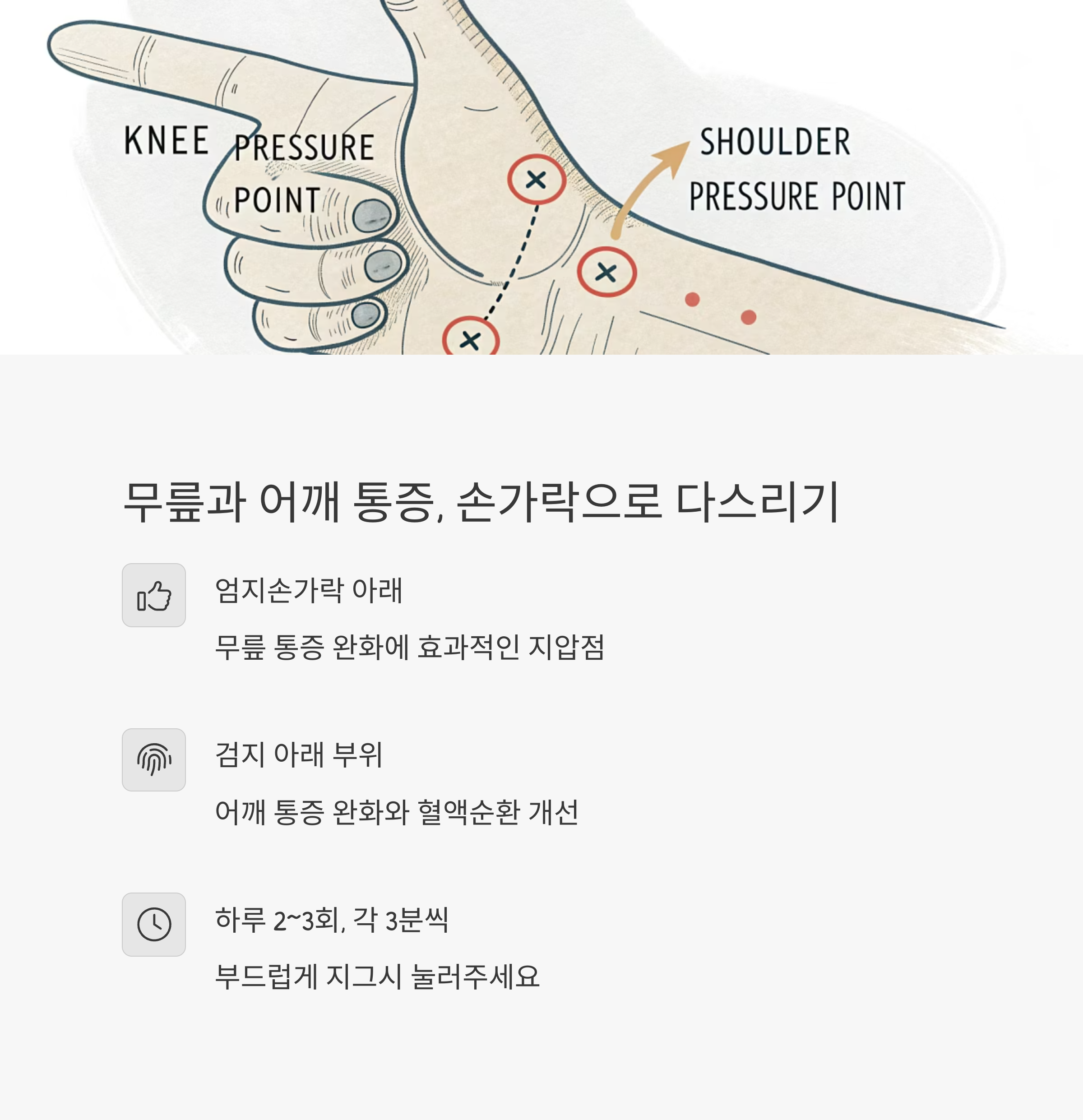 - 하루 2~3회, 각 지압 부위당 3~5분 정도가 적당합니다.
