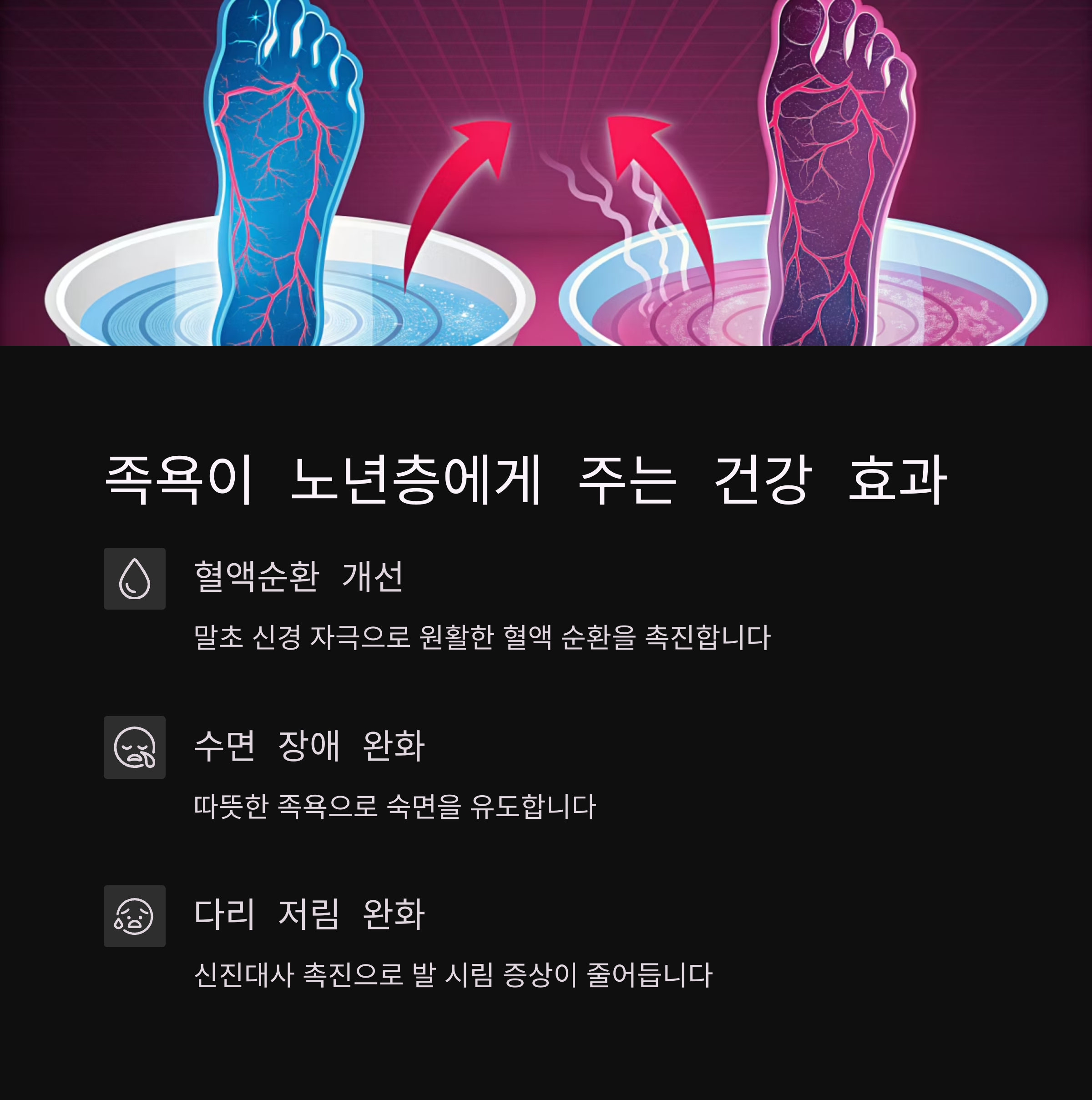 특히 추운 계절이나 저녁 시간, 발이 차가워지는 증상을 호소하는 분들에게 족욕은 수면의 질을 높이고, 전신 건강에도 긍정적인 영향을 미칩니다. 정기적인 족욕은 면역력 향상은 물론, 당뇨성 신경병증 예방에도 도움을 주며, 혈액 내 노폐물 배출을 원활하게 해주는 효과도 기대할 수 있습니다.