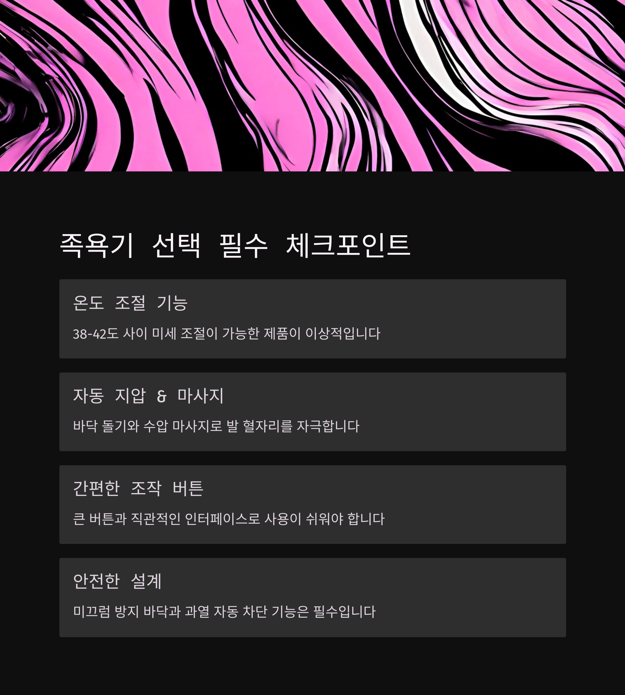 - 온도 조절 기능: 족욕 온도는 일반적으로 38~42도 사이가 적절합니다. 세밀한 온도 조절 기능이 있다면 화상 위험을 줄이고 보다 안전하게 사용할 수 있습니다.