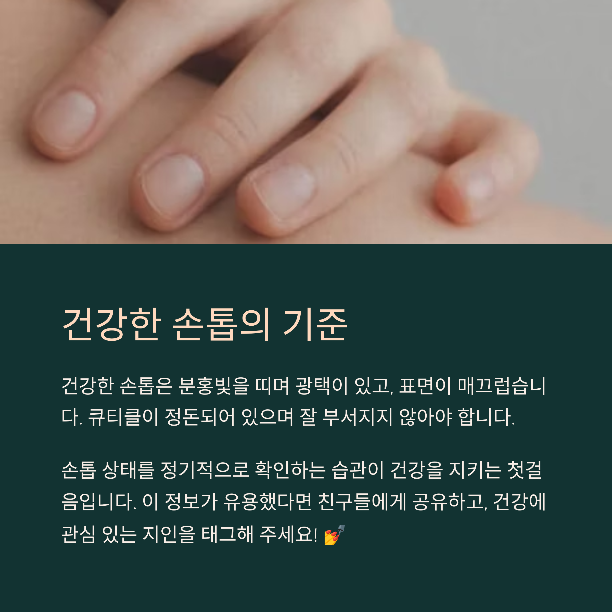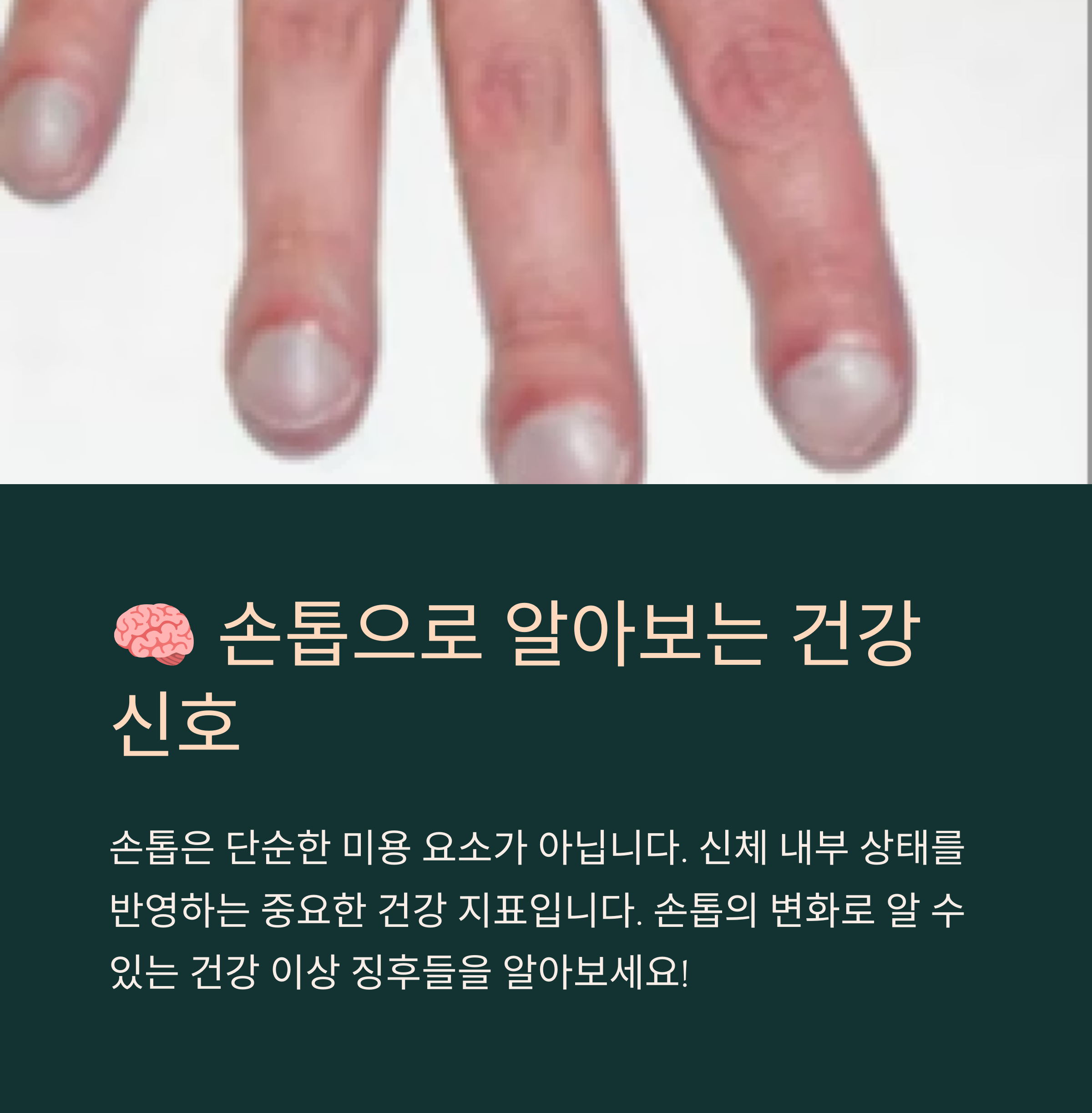 손톱은 우리 몸의 거울이라고 불릴 만큼 건강 상태를 섬세하게 반영하는 부위입니다. 작지만 중요한 신호를 놓치지 말고 정기적으로 관찰하고 관리하는 습관을 들이세요. 이상 징후가 지속된다면 전문가의 진료를 통해 정확한 진단을 받는 것이 필요합니다.