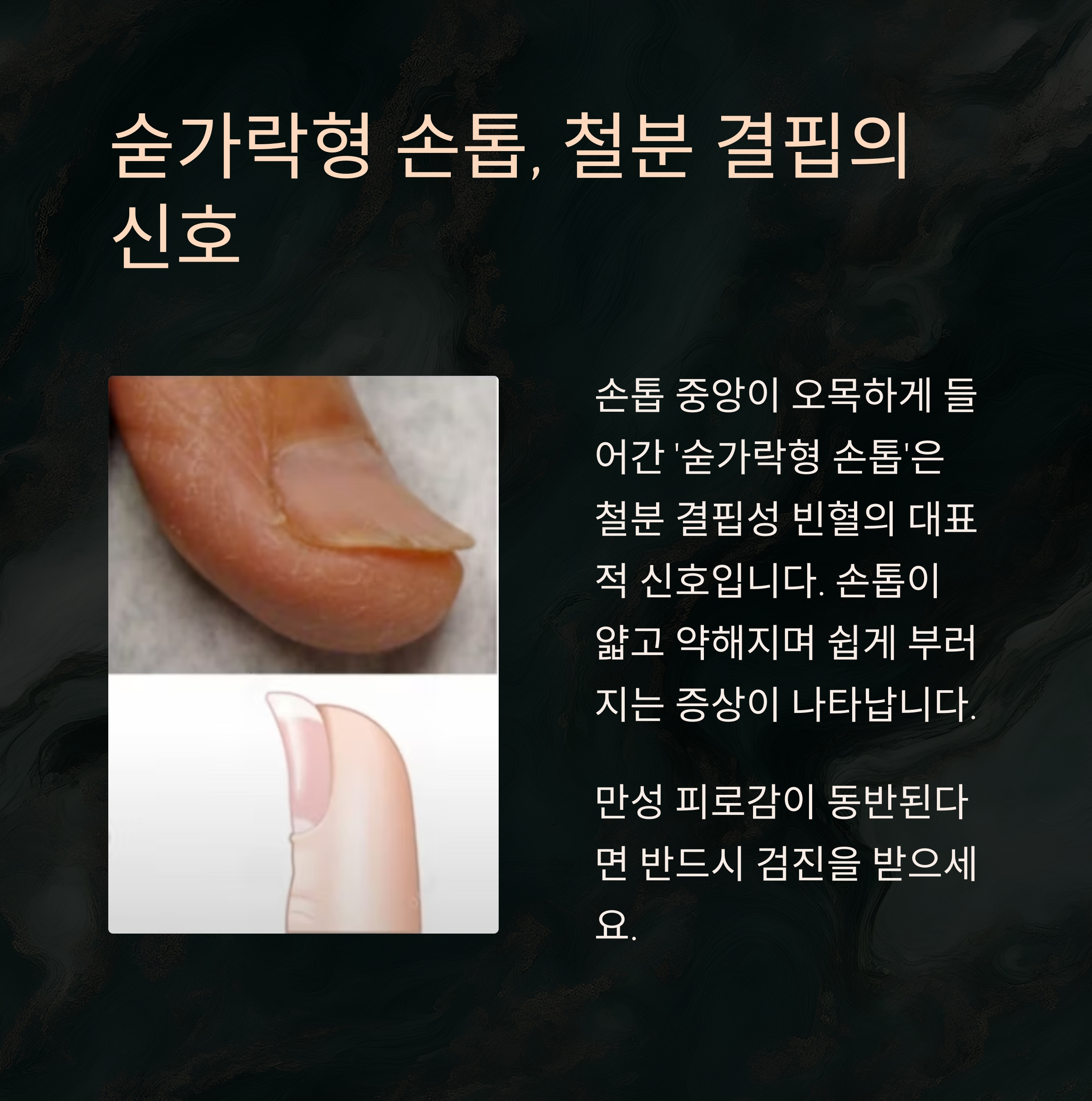 - 1. 숟가락형 손톱 (Koilonychia)손톱 중앙이 오목하게 들어가 숟가락처럼 보이는 경우, 철분 결핍성 빈혈을 의심할 수 있습니다. 이런 형태는 체내 산소 공급이 부족하다는 신호일 수 있으며, 특히 피로감이 동반된다면 조속한 검사가 필요합니다.